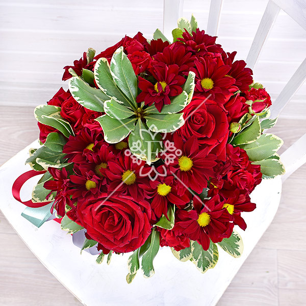 Здесь удачно сочетаются классические алые розы, кустовые хризантемы цвета кармин, красные кустовые розы и нежная зелень питтоспорума.