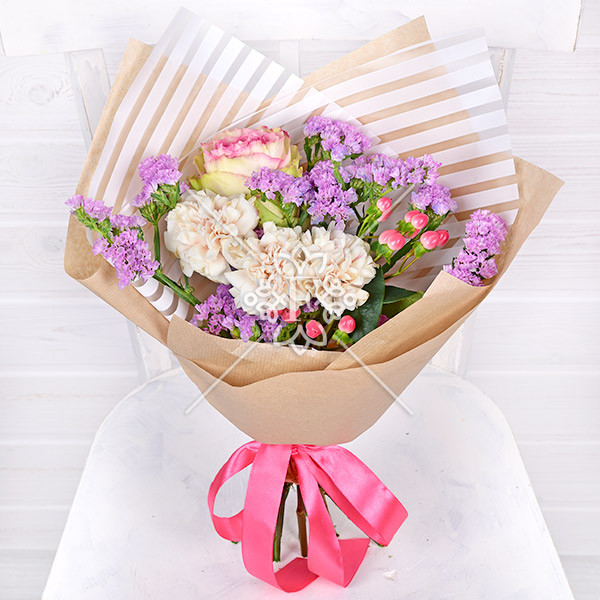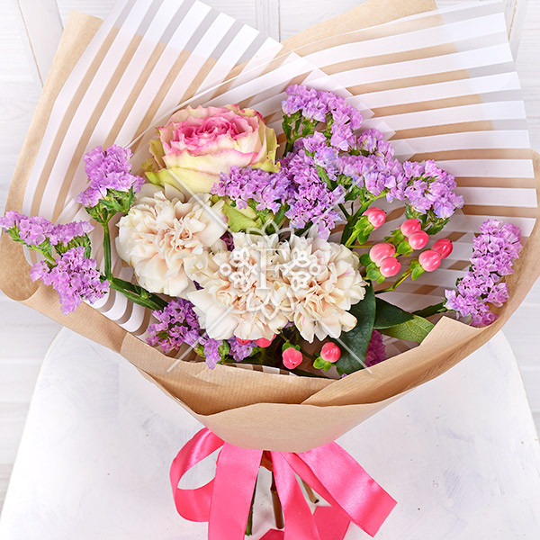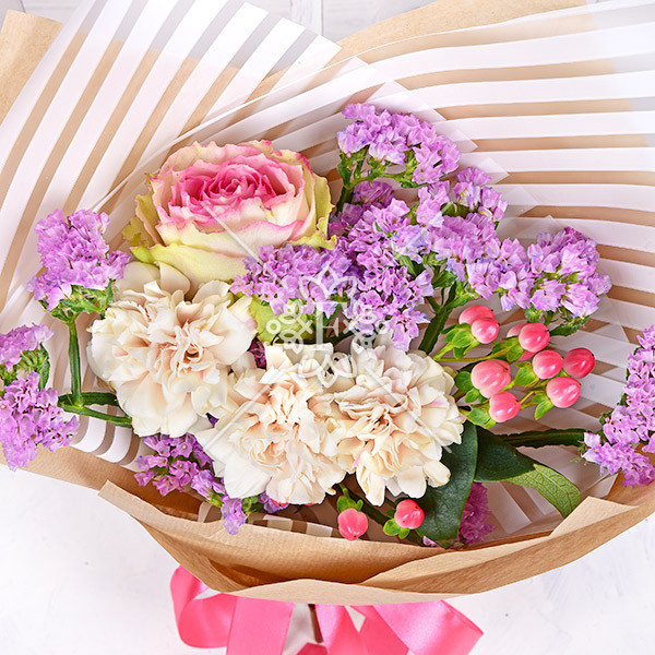 Роза розовая – 1 шт., гвоздика кремовая – 3 шт., гиперикум  розовый -1 шт., статица светло-сиреневая – 1 шт., упаковка, лента.